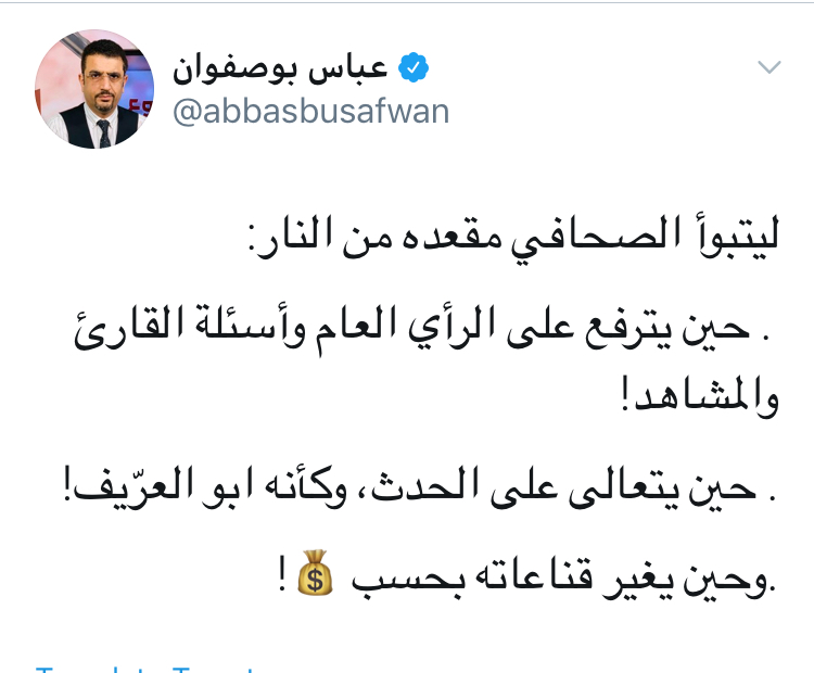 الصحفي الجيد يقدم معلومات وتحليل، لا اشاعات وتخرصات، لا يكذب ولايفتري.